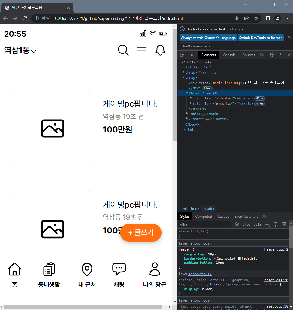 클론 코딩을 통해 직접 당근마켓 사이트를 구현해보는 실습까지 완료했다.